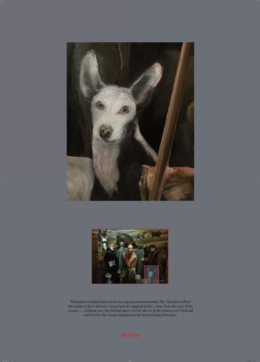 “Sebastian´s faithful dog watches for any unusual movement. The “Sacrifice of Ears” takes place a short distance away from the ongoing battle…..away from the eyes of the enemy……….without ears, the faithful squire will be able to fit the helmet over his head and deceive the enemy, disguised as his beloved king Sebastian.”