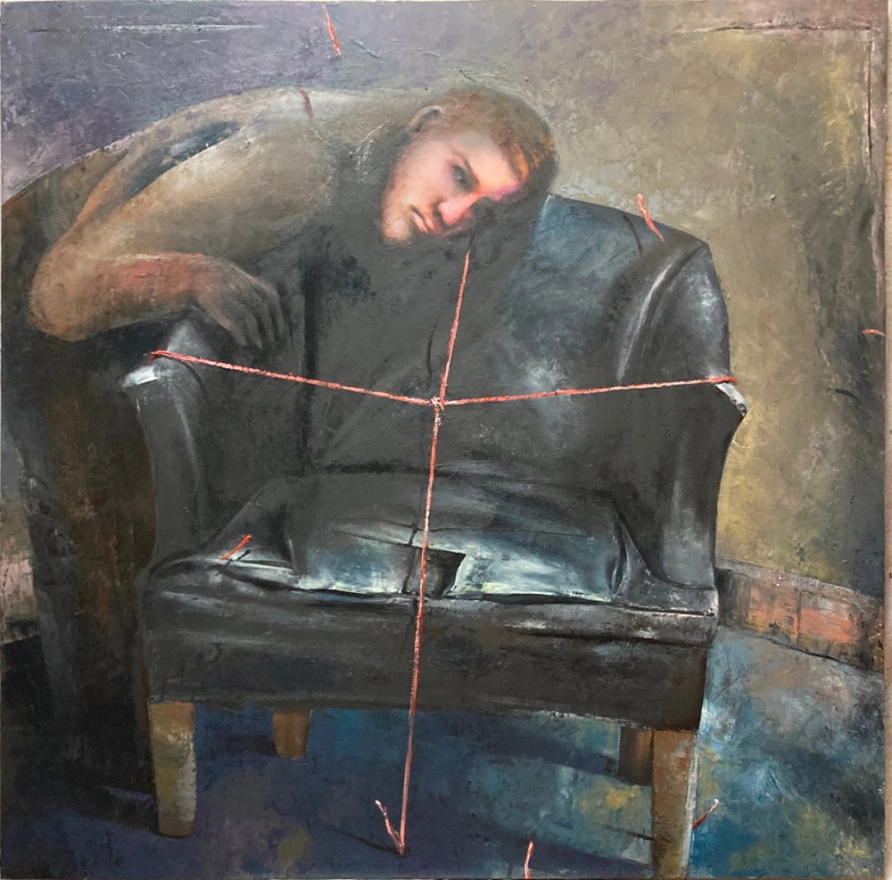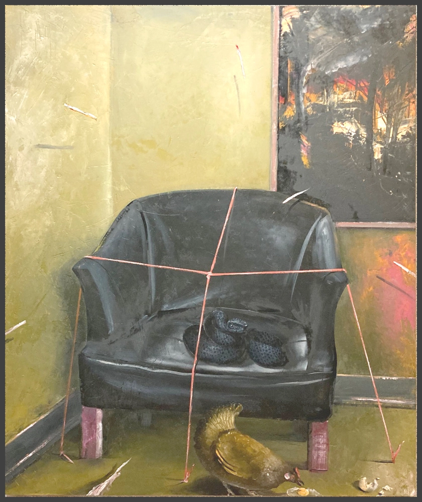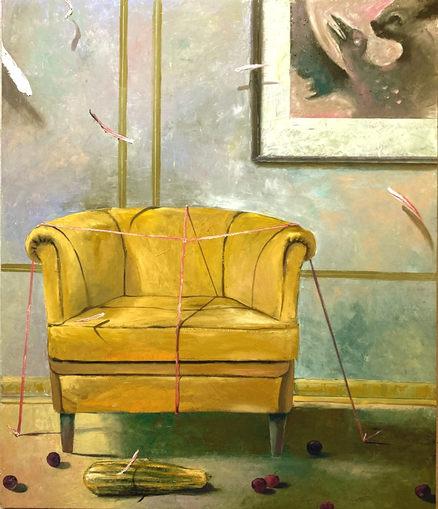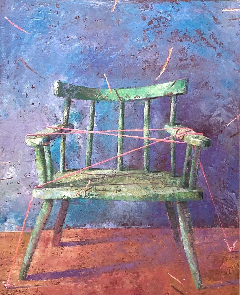 after I finished it….a couple of days later, suddenly I decided to drape a pink string over the chair……to make it “un-seatable”………an oblique joke, a kind of unexplainable visual joke……..